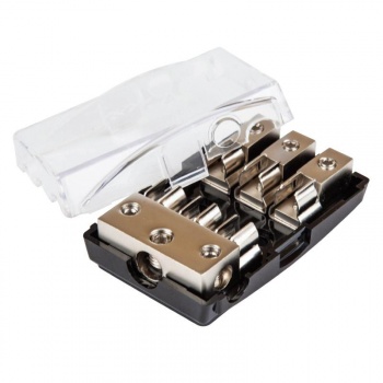 Автомобильный дистрибьютор питания. 1x2GA (33 мм2) и 2x4GA (21 мм2) входа, 3x6GA (10 мм2) выхода или 3x8GA (8 мм2) выхода. 3 держателя для предохранителя типа AGU.