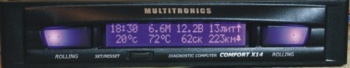Маршрутный мультидисплейный компьютер "COMFORT Х14" функционально соответствует МК "COMFORT Х15", в дополнение к которому содержит дополнительно блок полифонических мелодий и речевого информатора: голосовое сопровождение названия всехпараметров, проговаривание численных значений всех параметров, все предупреждения голосом, полифонические мелодии. Защищен патентом Российской федерации. Основные особенности прибора: 1. RGB дисплей произвольного цвета (512 цветов). 2. 8 параметров на дисплее одновременно. 3. 3 программируемых мультидисплея пользователя. 4. Тест и оценка емкости аккумулятора. 5. Режим сушки свечей "Горячий запуск". 6. Автоматическая/ручная установка протокола. 7. Выход управления внешними устройствами. 8. Два универсальных программируемых таймера. 9. Смена 8-и параметров одним касанием. 10. Коррекция температуры включения вентилятора. 11. Уровень топлива в баке с датчика уровня топлива или с ЭБУ. 12. Код идентификации пользователя (PIN-код).*** 13. Мультидисплей "Сутки" с расчетом стоимости поездки. 14. Голосовое озвучивание всех параметров, полифония. 15. Все предупреждения голосом. *** Внимание: начиная с версии 24.06 и выше у маршрутного компьютера отсутствует возможность установки кода идентификации. Соответственно изменено назначение группы 8 "Дисплея установок 3". Вместо группы "Изменение кода" вводится группа выбора способа расчета прогноза пробега на остатке топлива в баке: на основе среднего расхода топлива на 100 км и на основе среднего расхода топлива за последние 10 км. |