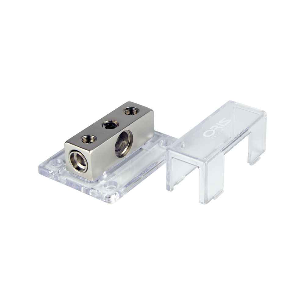 Высококачественный распределитель питания для подключения автомобильных усилителей мощности, с входными терминалами 0Ga, выходными терминалами 2 - 4Ga, переходными втулками и винтовыми зажимами.