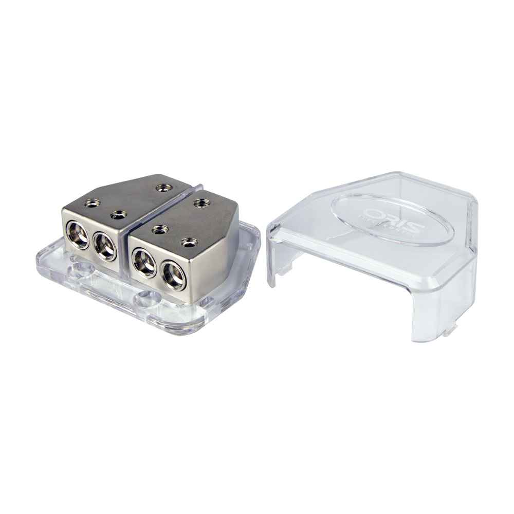 Высококачественный распределитель питания для подключения автомобильных усилителей мощности, с входными терминалами 4Ga, выходными терминалами 8Ga, переходными втулками и винтовыми зажимами.