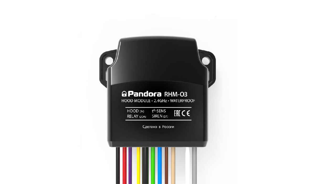 Подкапотный модуль Pandora RHM-03 значительно упрощает процесс установки сигнализации на современные автомобили — больше не требуется протягивать под капот из салона провода термодатчика двигателя, концевика капота, сирены, замка капота и управляющие линии реле блокировки — все эти устройства можно подключить к Pandora RHM-03, который связывается с базовым блоком сигнализации на частоте 2,4 ГГц.